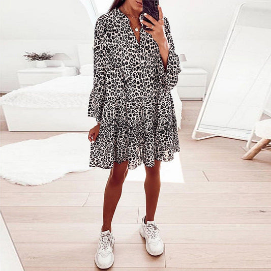 Printed Long-sleeved Loose V-neck Patchwork Dress