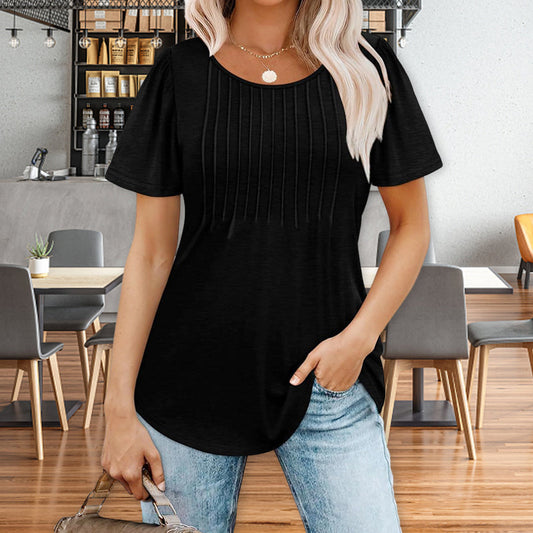 Women's Summer Round Neck Short Sleeve Pleated T-Shirt