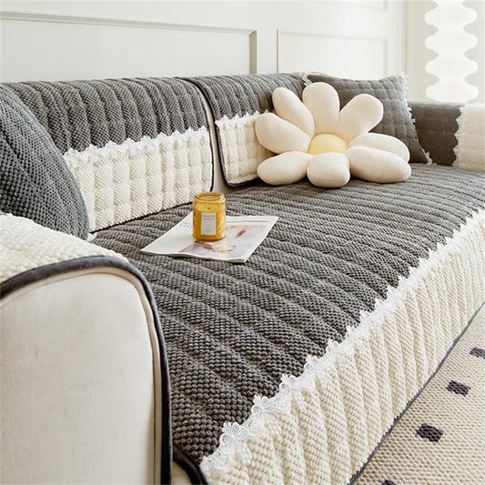 Corduroy Colour Block Non-slip Couch Cover with Lace