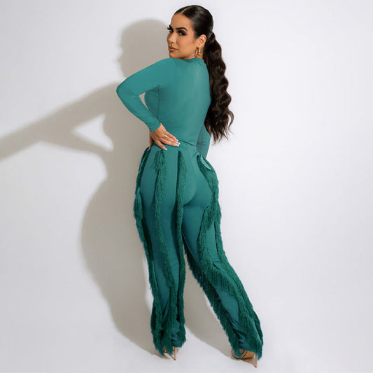 Women 2 Piece Casual Long Sleeve High Waist Tassel Fringe Outfits Jumpsuit Set