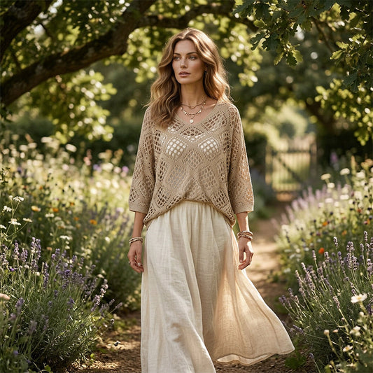 🥰Summer Sale💛Womens Bohemian-Inspired Beige Crochet Top With V-Neck