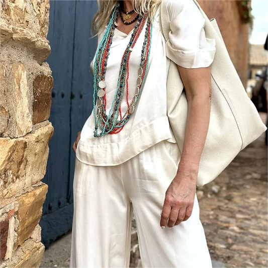 Casual Solid Color V-Neck Shirt & Pants Cotton Linen Two-Piece Set