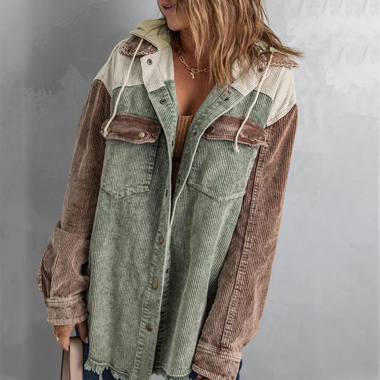 Women's Casual Corduroy Hooded Color Block Jacket