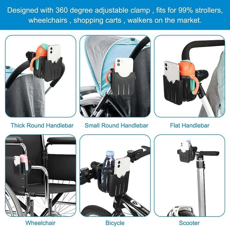 - The stroller cup holder with phone holder fits for most stroller, walker, wheelchair, bicycle, scooter, boat handle bar, shopping cart, kayak, ATV, motorcycle, treadmill etc.