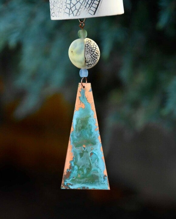 Materials: clay, copper, wire, beads, ceramics, chimes, patina, resin
