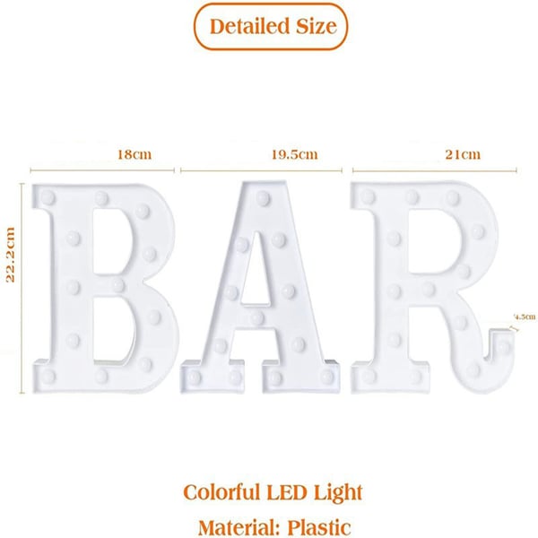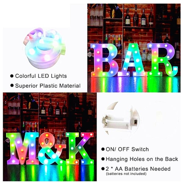 26 Alphabet letters and & symbols provide endless possibilities of creating message. Spell out any name or phrase with these fabulous light up alphabet letters such as “BAR” in your wine rack, “LOVE” at a wedding or add initials to children’s room.