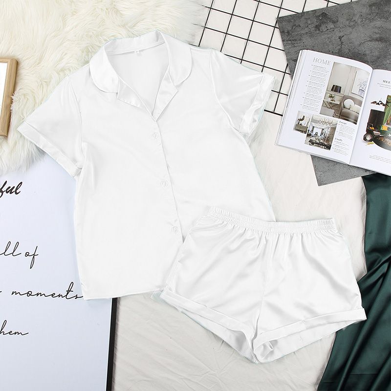 Simulated silk pajamas. Light fabric shorts and a button-up top in solid color.