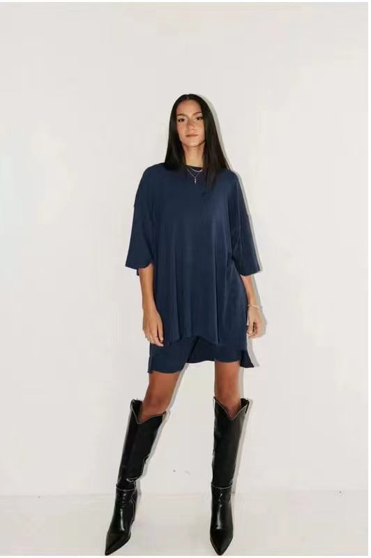 This oversized boyfriend tee comes with a pair of matching biker shorts, sexy chic and energetic style. Flowy and comfy textured fabrication is soft, very stretchy and ribbed, attractive for summer! Once you��re in these, you��ll never, ever want to take them off.