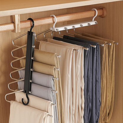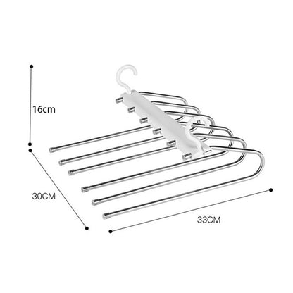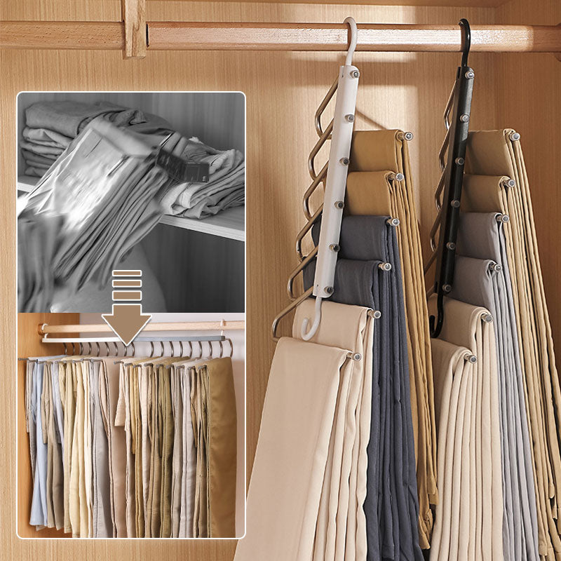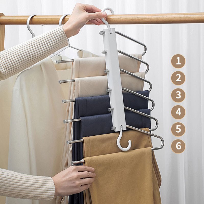 HOLDS 6 PIECES AT ONCE - With its innovative design, our Multi-Functional Pants Hanger can hold up to 6 pieces of clothing at once, allowing you to maximize storage efficiency and keep your closet neat and organized. Say goodbye to cluttered closets and hello to streamlined storage with our multi-functional hanger.