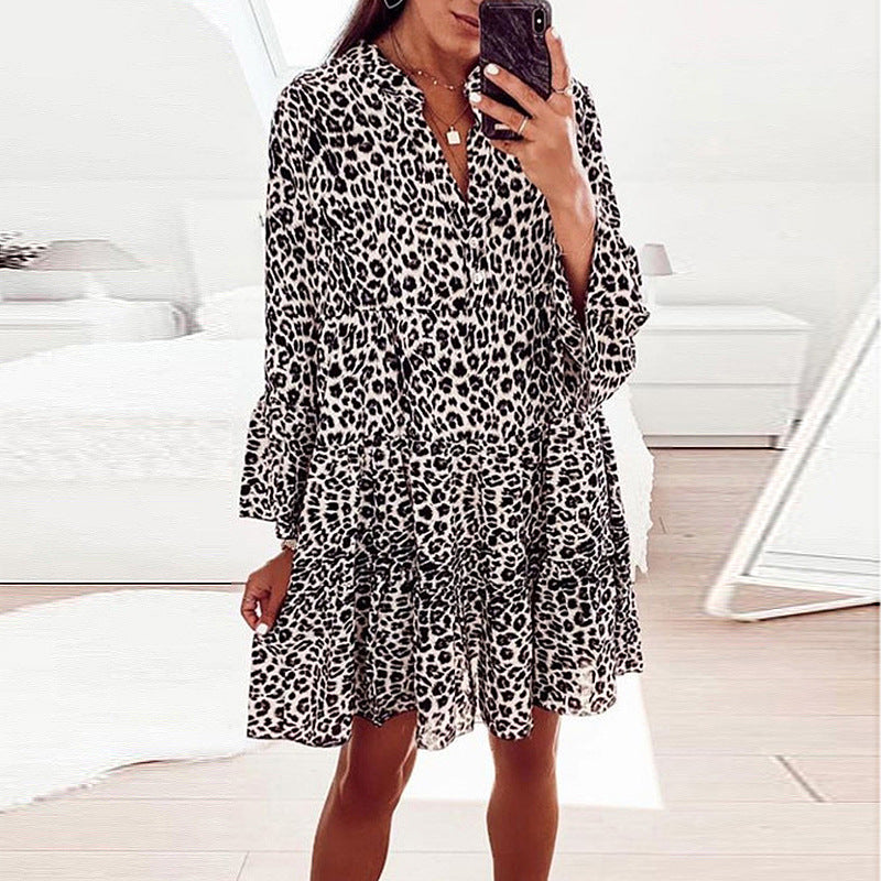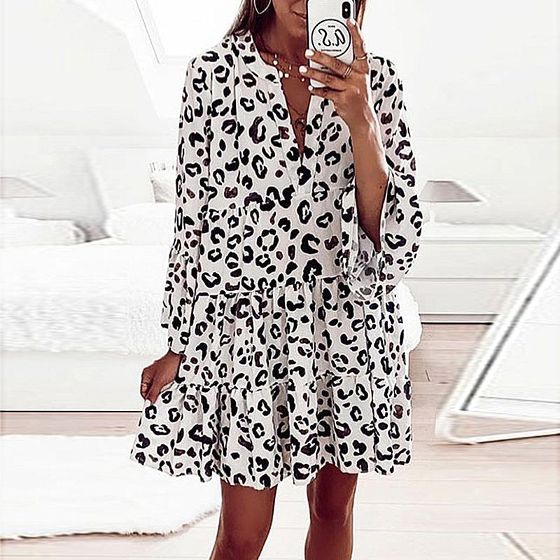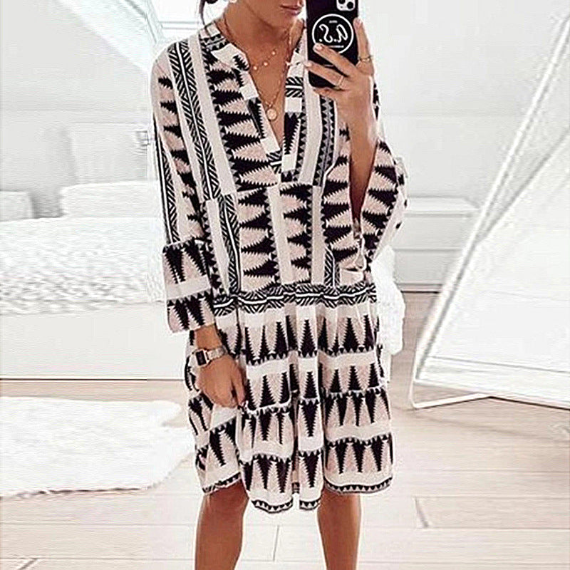 This Printed Long-sleeved Loose V-neck Patchwork Dress features a deep V-neck, ruffle sleeves, and a loose fit. It is made from soft and breathable stretch polyester fabric, making it comfortable for any occasion.