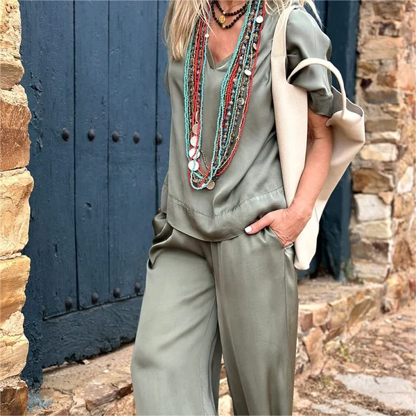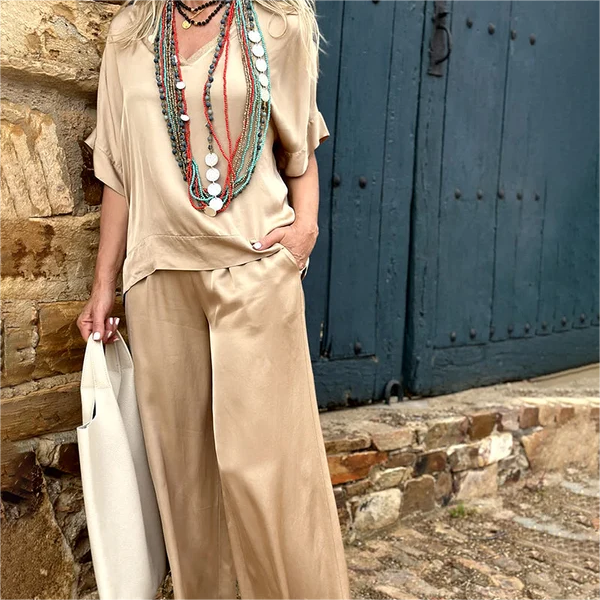 Package Included:1* V-Neck Short-Sleeve Top Wide-Leg Pants 2-Piece Set