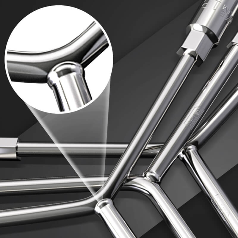 Made of heat-treated chrome vanadium steel to improve strength and durability, with a polished and chrome-plated finish to prevent rust and corrosion.